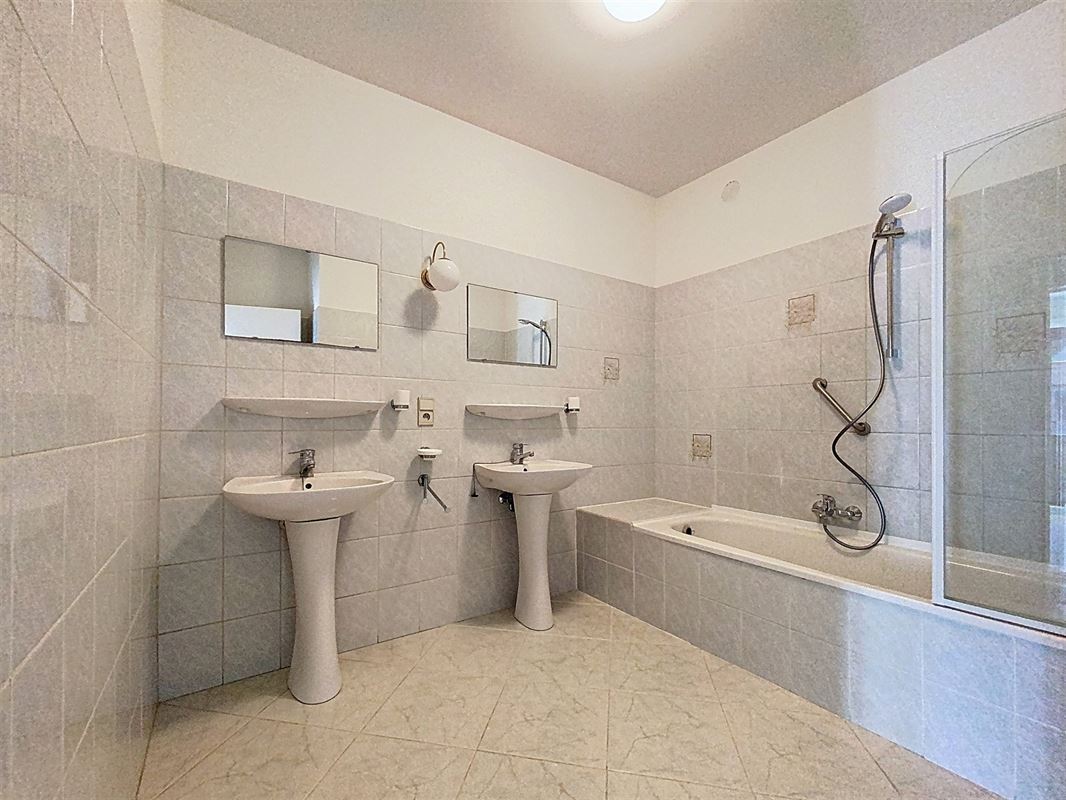 De badkamer is praktisch ingericht met een dubbele wastafel en een douche in bad.