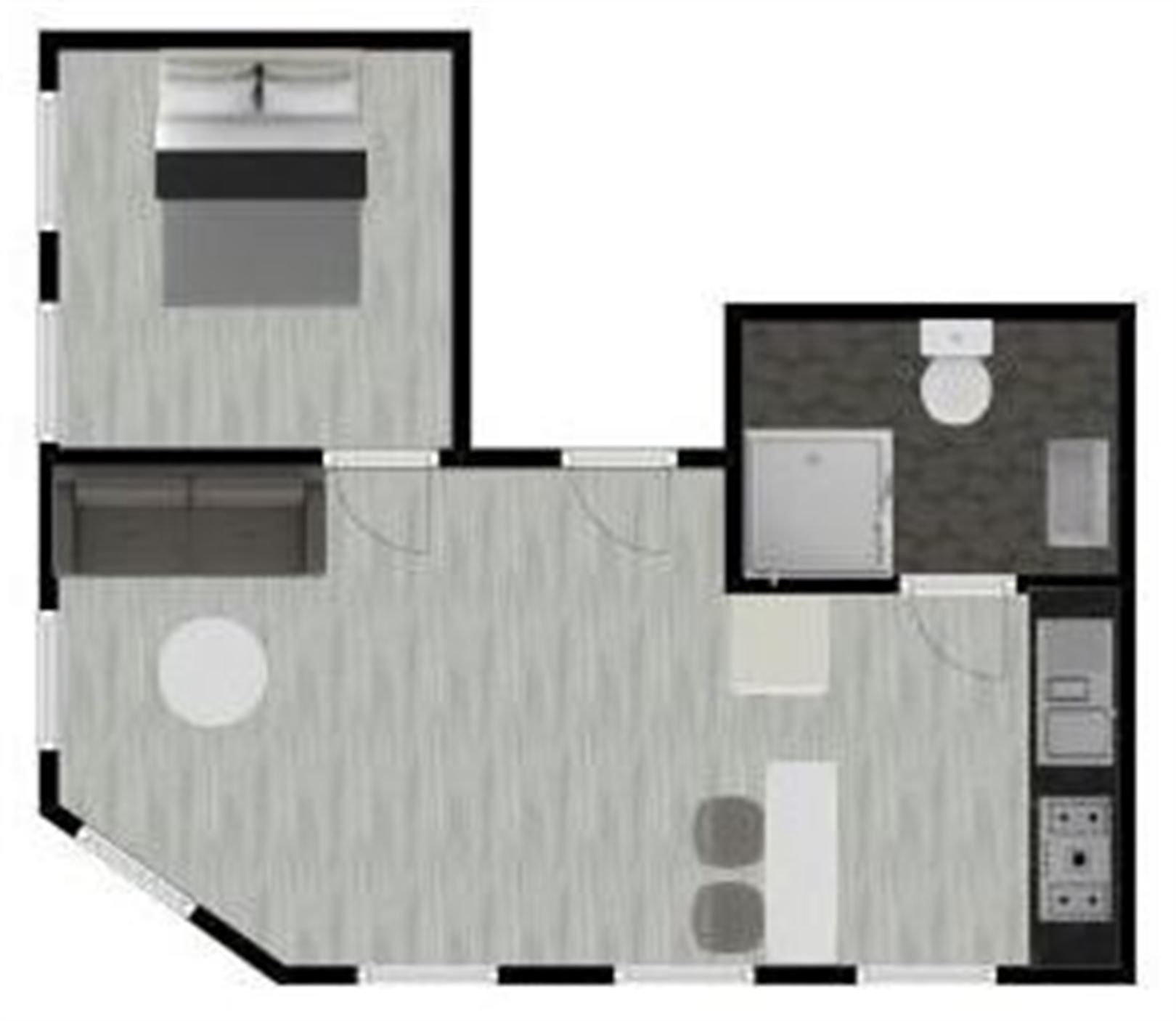 Je komt het appartement op de eerste verdieping binnen in de woonkamer met veel lichtinval en uitzicht op het water, hiernaast is ook de ingerichte open keuken met eettoog (elektrisch kookvuur, dampkap, oven en ijskast) en de badkamer met douche, toilet en wastafel. Ook in de badkamer is de aansluiting voor de wasmachine. Aan de andere zijde is de ruime slaapkamer (+/- 14m²).