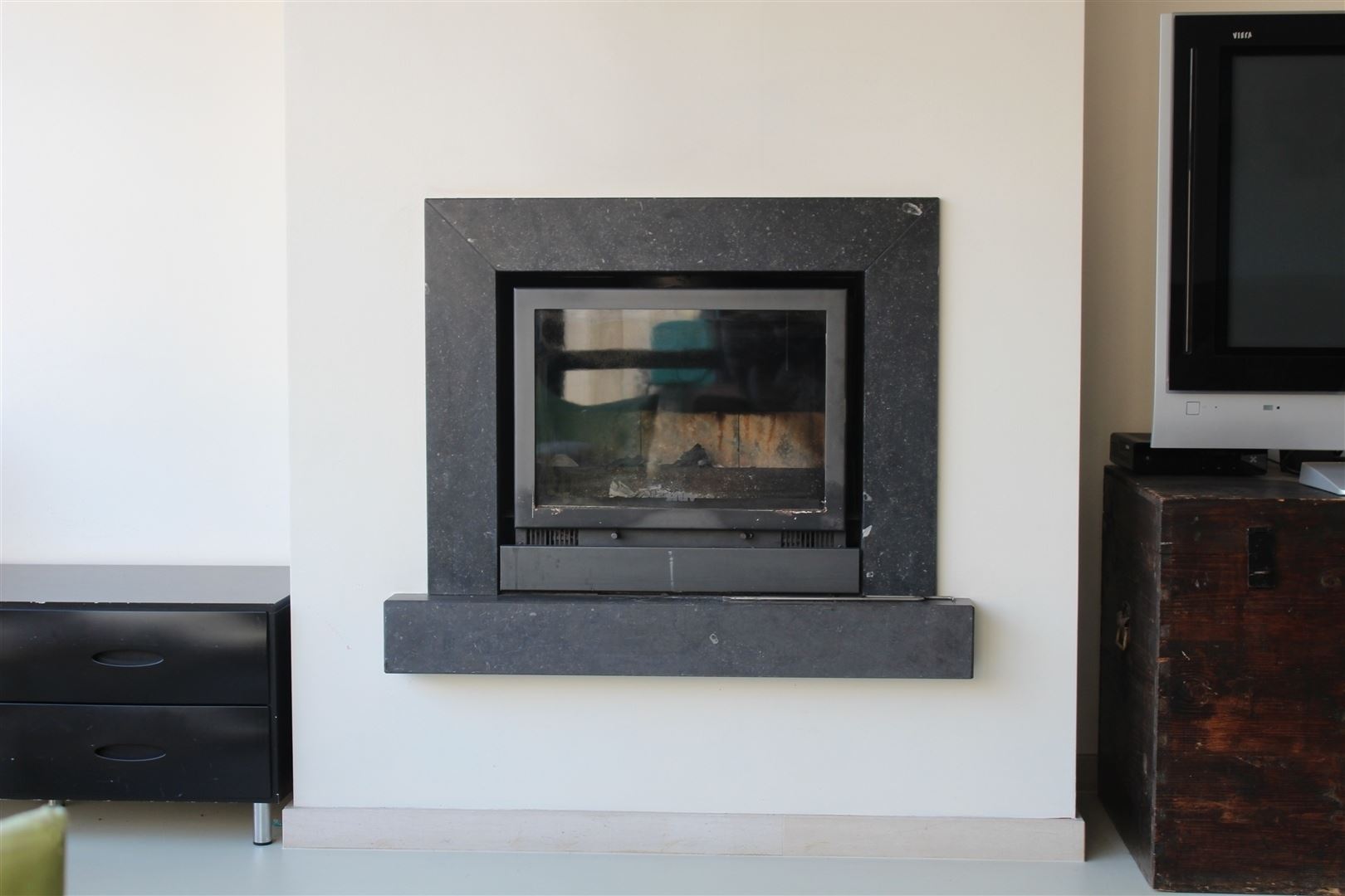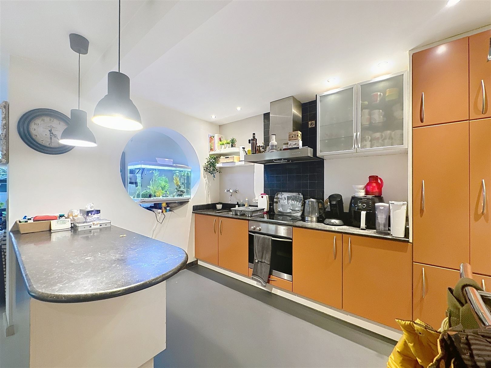 U betreedt de woning via een inkomhal met gastentoilet. Vervolgens komt u in de lichte en ruime woonkamer met sierhaard en gietvloer, die naadloos overloopt in de volledig uitgeruste open keuken. Het gelijkvloers is bovendien voorzien van inbouwspots, wat zorgt voor een warme en moderne uitstraling.